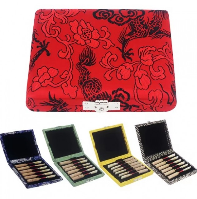 Tre etui med rødt silkestoff dekor til 6 oborør